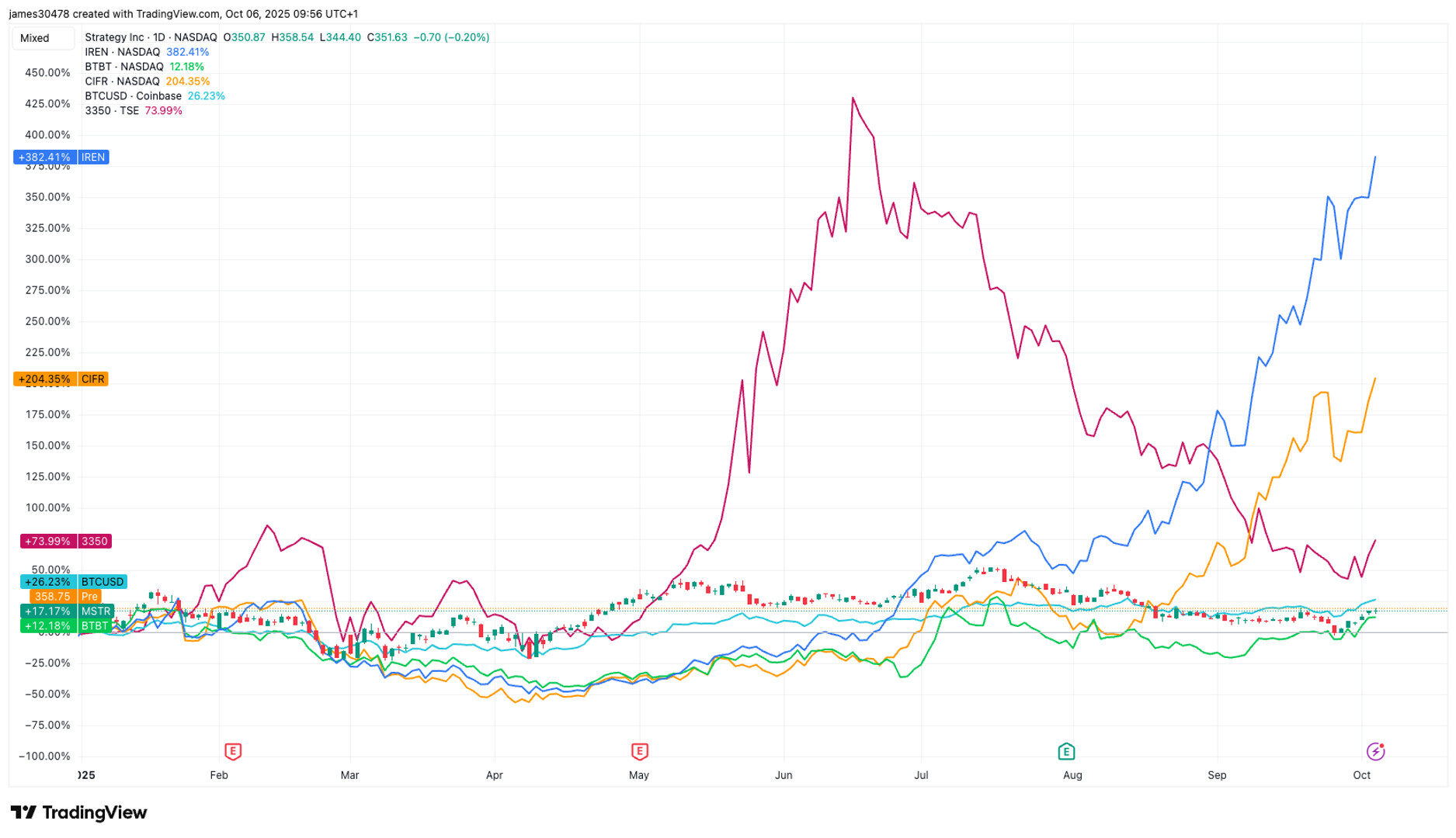 So far this year, crypto-linked stocks have performed very differently: Iris Energy (IREN) has surged 382%, Cipher Mining (CIFR) 205%, Metaplanet 74%, MicroStrategy (MSTR) 17%, and Bit Digital (BTBT) 12%.