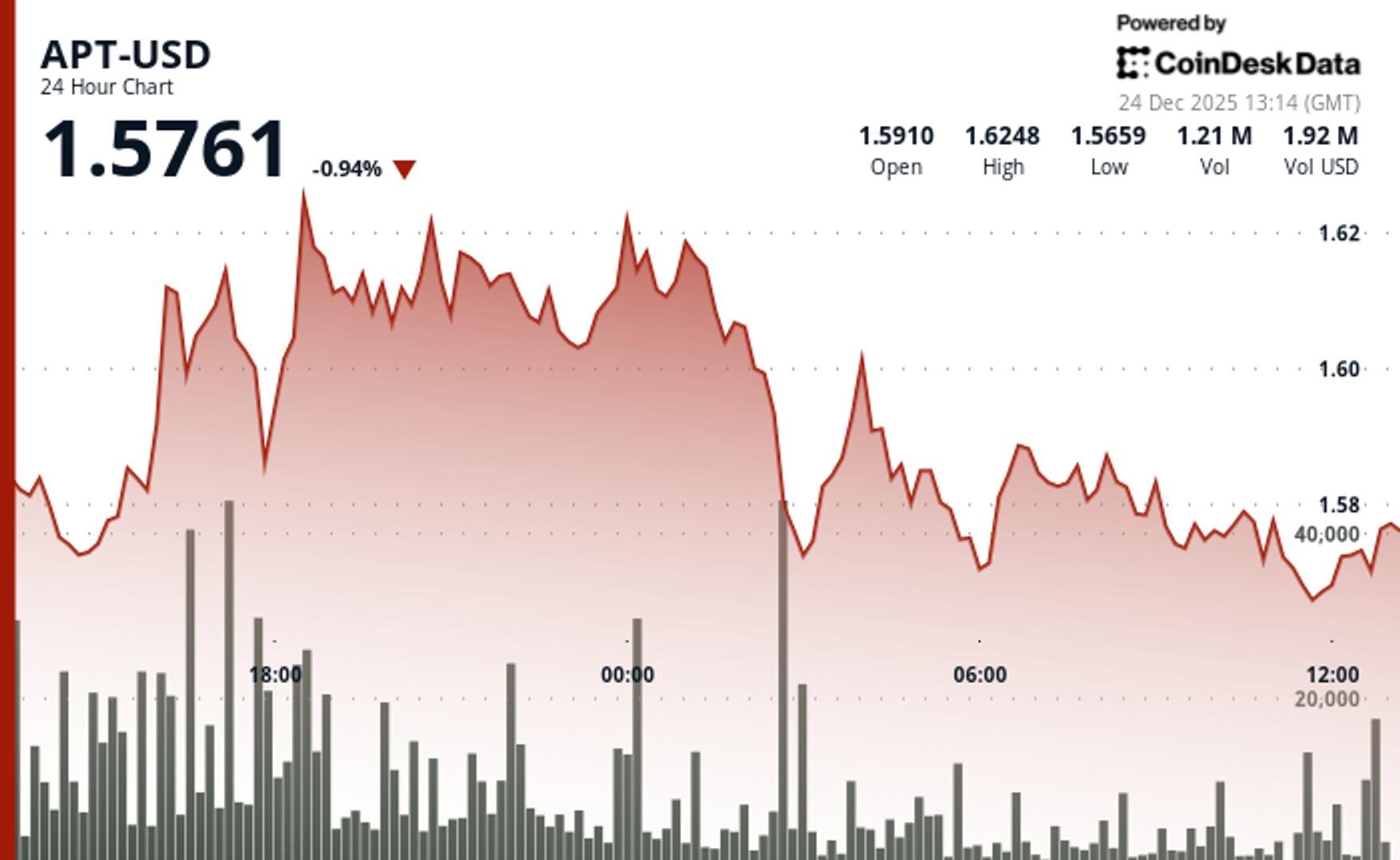 APT slipped 1% to $1.56 over the last 24 hours, as wider crypto markets also retreated. The CoinDesk 20 index was 0.6% lower at publication time.