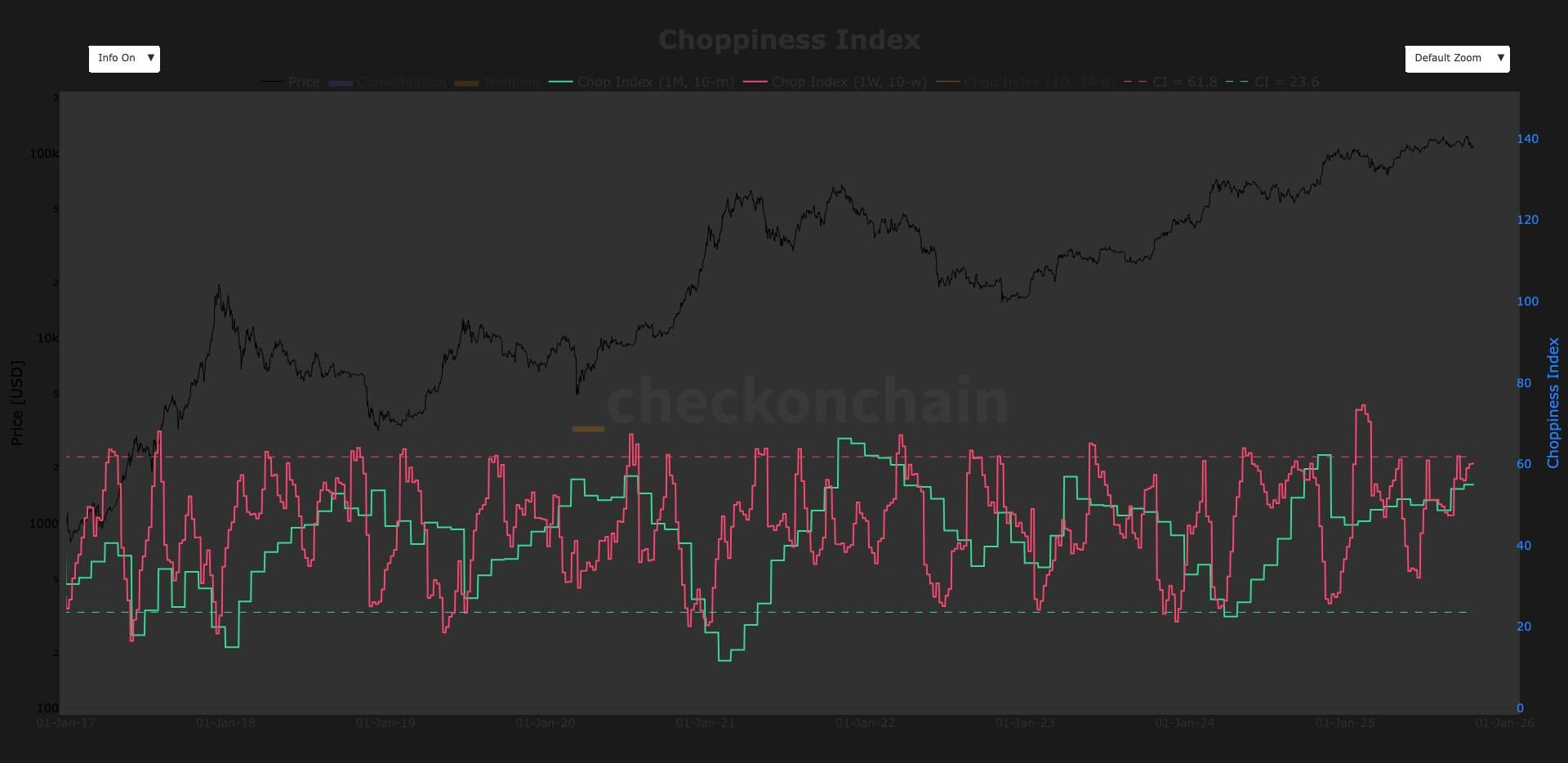 - On-chain data shows elevated choppiness levels, suggesting the market may continue to consolidate before making its next major move.