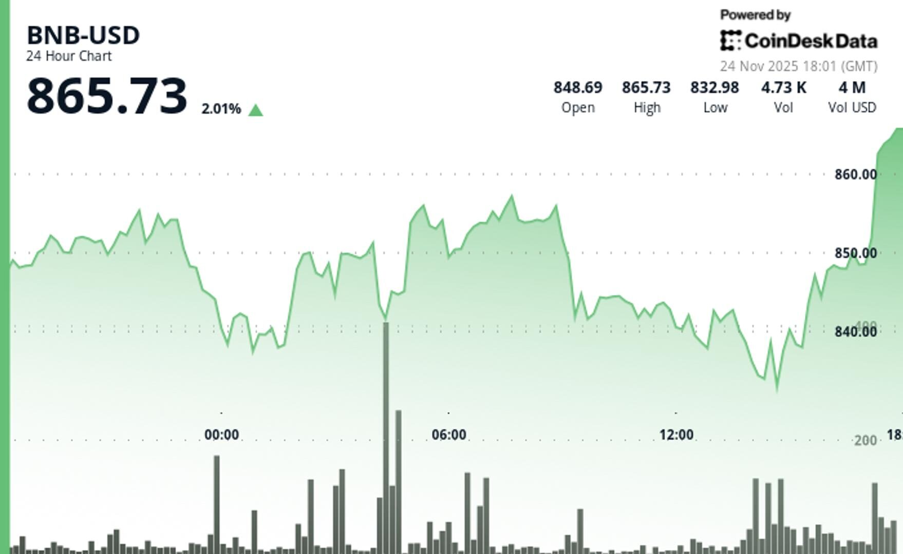 The last 24 hours saw BNB peak above $866 as it carved out a broad range before recovering in the last few hours. The bounce lifted the token above multiple resistance zones that had formed after a series of failed attempts earlier in the week, according to CoinDesk Research’s technical analysis data model.