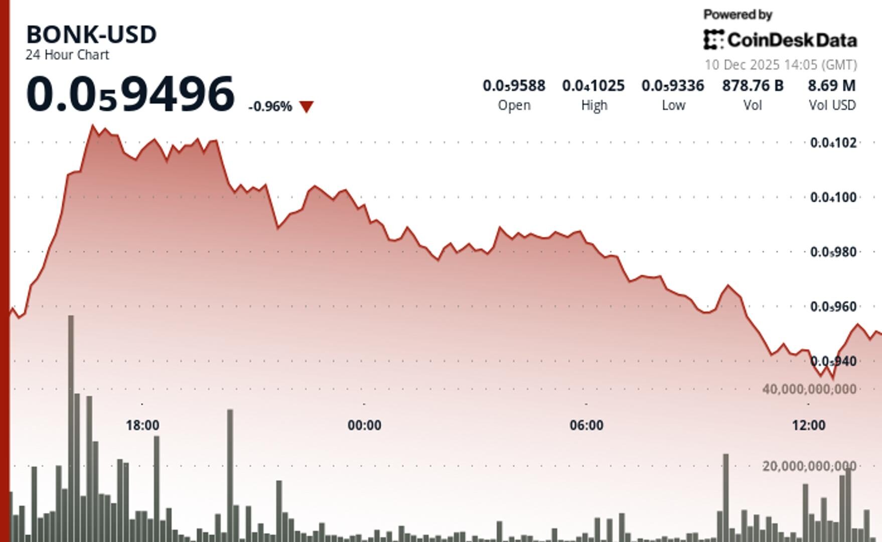 • BONK fell 3.94% and lost the $0.00001000 psychological level despite strong early-session momentum.