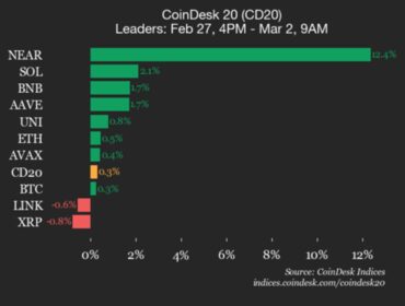 CoinDesk CoinDesk 20 performance update: NEAR Protocol (NEAR) jumps 12.4% over weekend Solana (SOL), up 2.1% from Friday, was also among the top performers. by CoinDesk Indices March 2, 2026 0 commentFacebookTwitterLinkedInPinterestshare