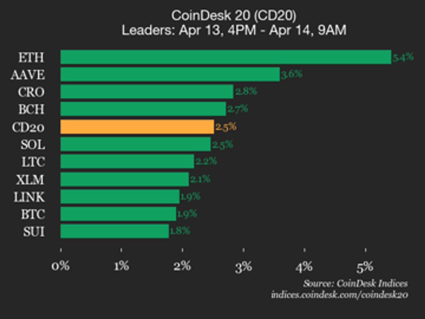 FacebookTwitterLinkedInPinterest CoinDesk CoinDesk 20 performance update: Ethereum (ETH) price rises 5.4% By CoinDesk Indices April 14, 2026 0 Aave (AAVE), up 3.6% from Monday, joined Ethereum as a top performer. Post navigation Previous Post JPMorgan CFO warns stablecoins risk becoming ‘regulatory arbitrage’ play Next Post XRP Ledger adds zero-knowledge proofs targeting institutional privacy gap