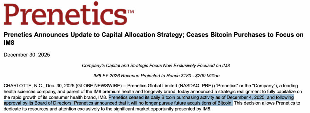 Prenetics Global Limited said it has ended its bitcoin purchasing program and will redirect its capital and strategic focus entirely toward IM8, its fast-growing consumer health and longevity brand co-founded with David Beckham.