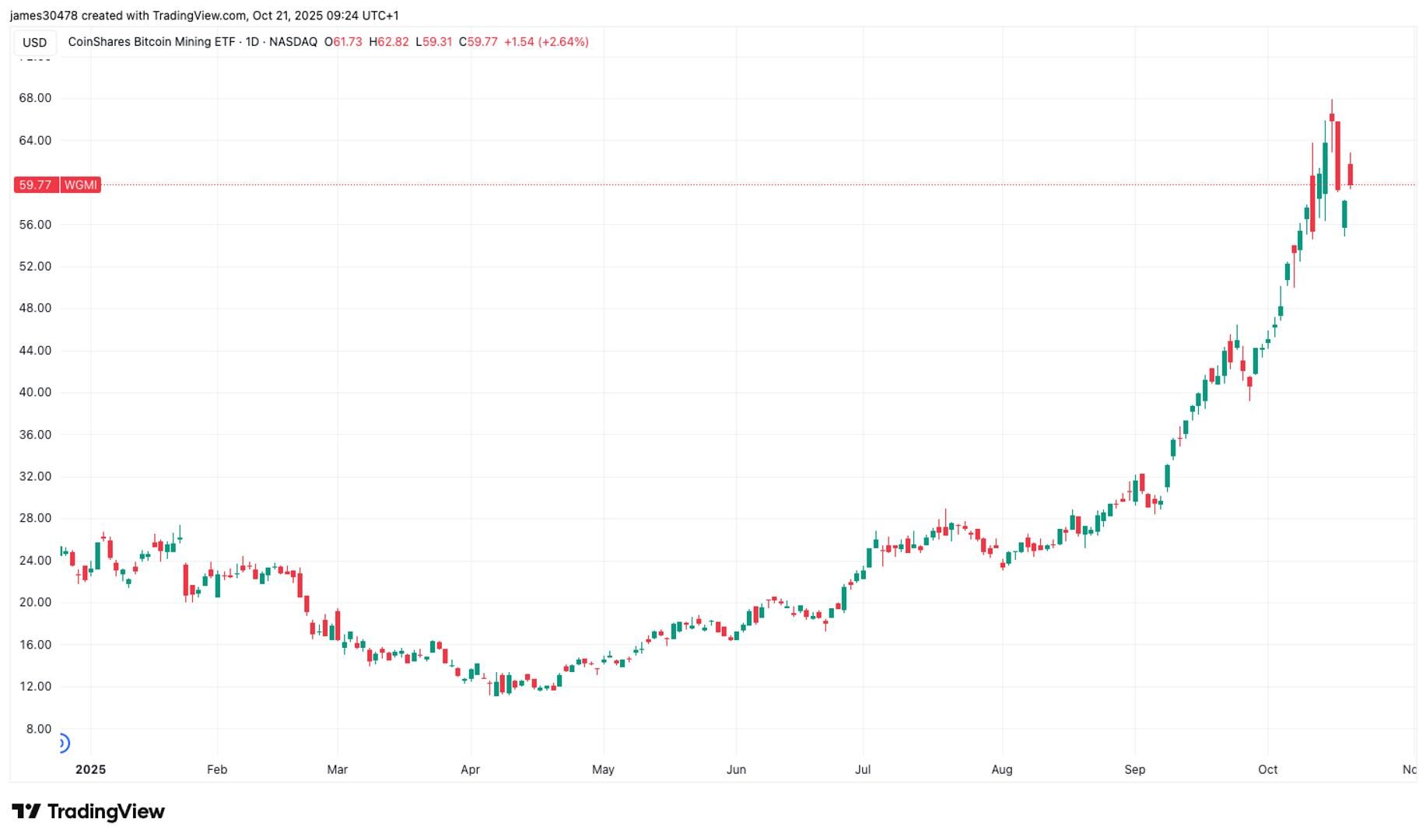 The CoinShares Bitcoin Mining ETF (WGMI), often seen as a proxy for the broader bitcoin mining sector, is up 160% year-to-date.