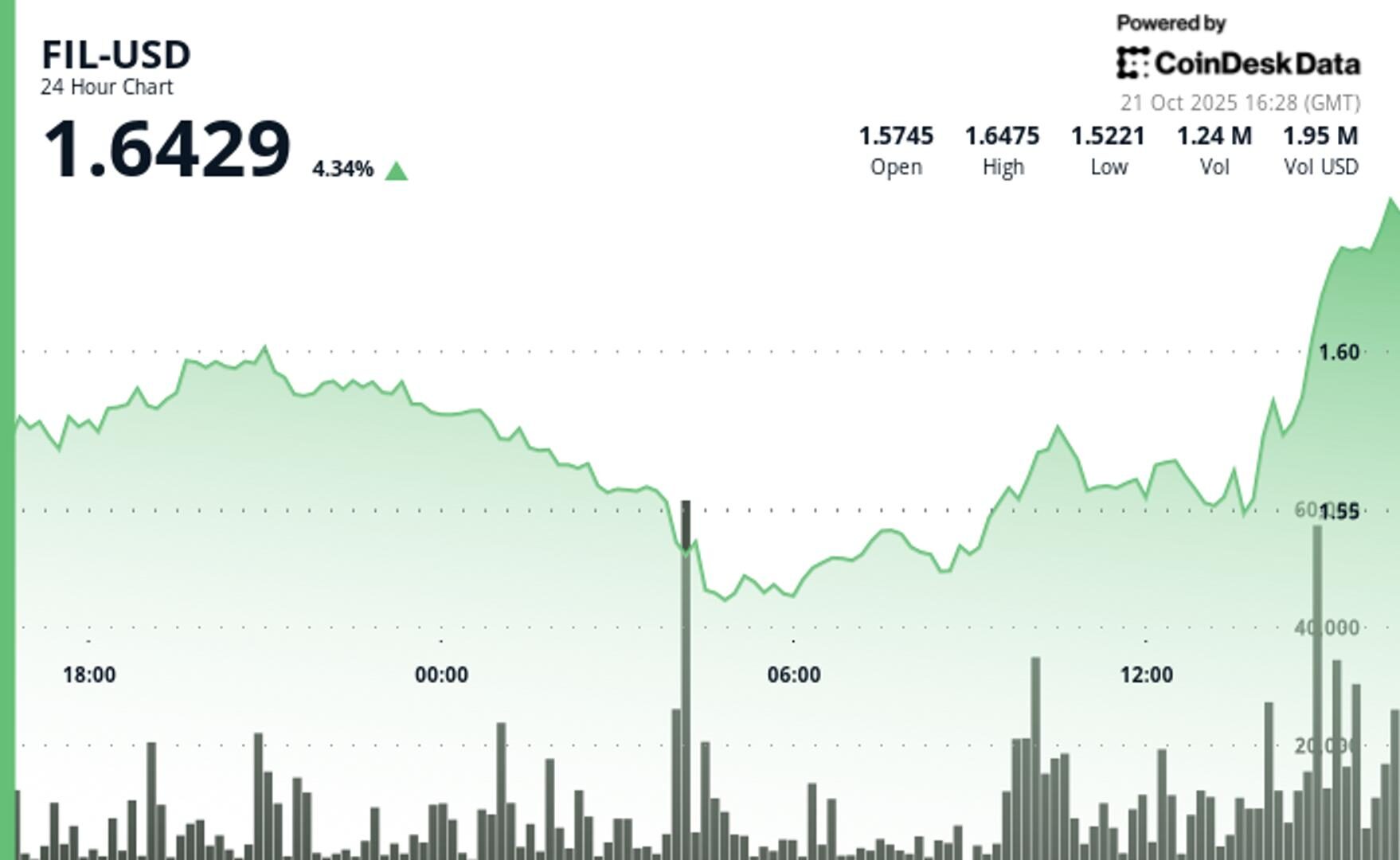 FIL$1.6448 surged over 4% to $1.65 on Tuesday early afternoon, breaking above a key $1.60 psychological resistance, according to CoinDesk Research’s technical analysis model.