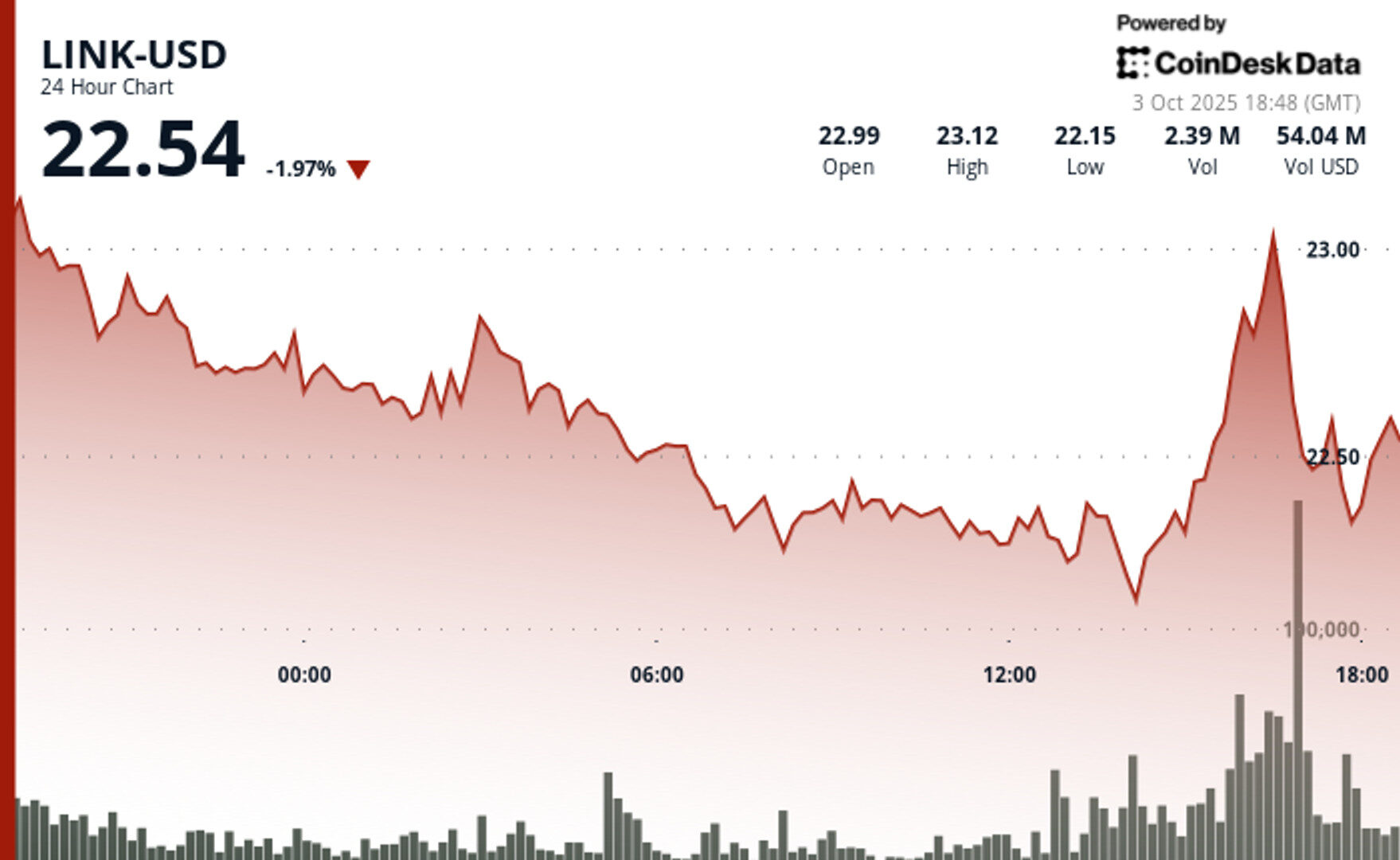 The native token of oracle network Chainlink LINK$22.59 pulled back slightly on Friday, establishing a higher low, posting a 6.7% gain this week. The price action has been supported by a string of news headlines about institutions and protocols tapping Chainlink’s services.