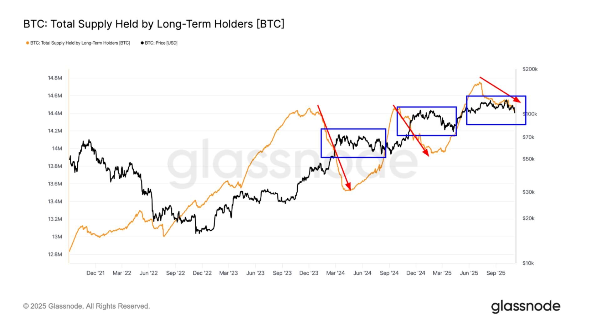 - Long-term holders have reduced their supply from 14.7 million BTC in July to 14.4 million BTC, the third major profit-taking phase since late 2023.