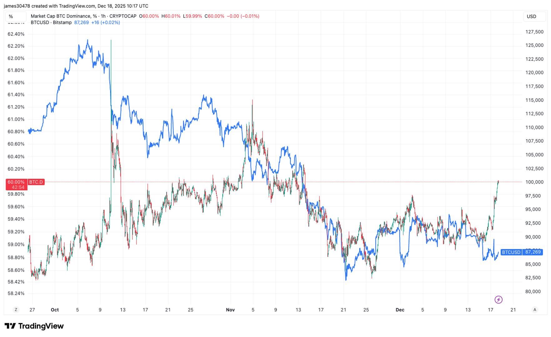 Bitcoin dominance, which measures BTC’s share of the total cryptocurrency market capitalization, has climbed to 60%. This is the highest level since Nov. 14, when bitcoin was trading near $100,000. The largest cryptocurrency is currently trading around $87,000.
