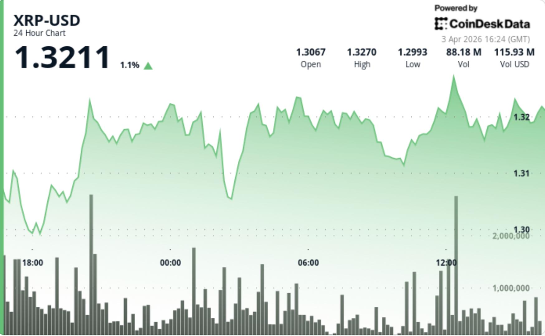FacebookTwitterLinkedInPinterest CoinDesk What next as XRP rises to $1.33 but fails to break out By Shaurya Malwa April 3, 2026 0 Price tracks broader crypto flows, with range-bound structure intact until $1.35 breaks. Post navigation Previous Post CoinDesk 20 performance update: Bitcoin (BTC) trades flat while altcoins rise