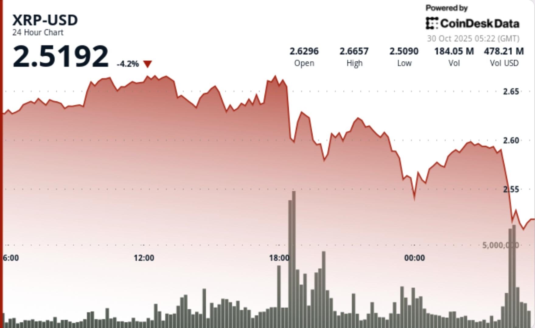 - XRP slid from $2.63 to $2.59 after a failed breakout above the $2.67 zone, with trading volume spiking to roughly 392.6 million tokens—about 658% above its recent average—during the rejection.